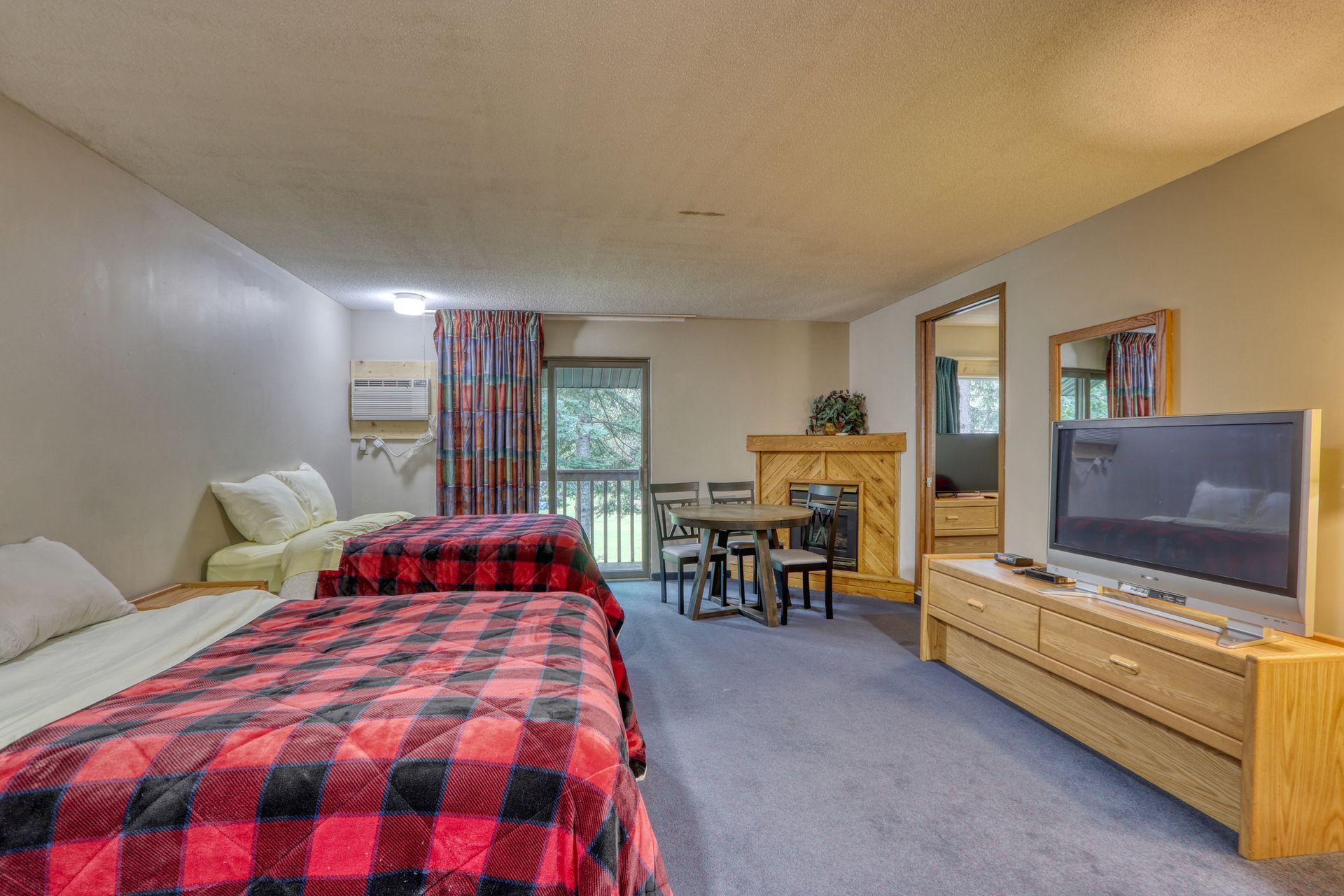 Family Room - This spacious two-room suite features a kitchenette equipped with a microwave and mini fridge. The suite includes a private queen bedroom that offers added privacy, while the main room boasts two full-size beds, a cozy TV viewing area, and the kitchenette. Additionally, you'll find a standard jetted tub/shower combination for your comfort.